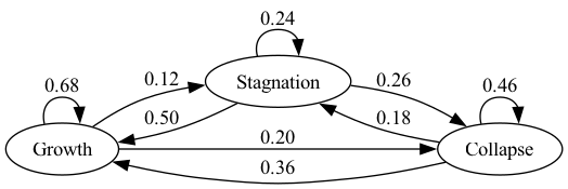 For example, the arrow from mild recession to normal growth has 0.145 next to it.